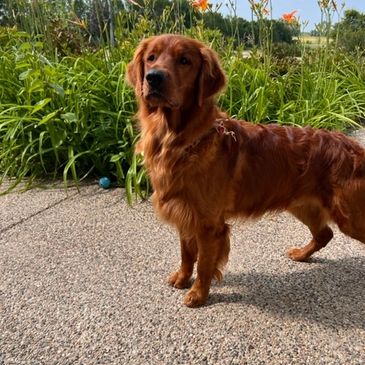 Shotgun Ryder, always ready to go. He supports an athletic build and is a stunning example of the Golden Retriever measuring at 23.5" at the shoulder and weighing in at 68 lbs. He supports a gorgeous, thick dark golden red coat. Ryder lives life fully and enjoys every minute. Is excellent with retrieval, loves the water and agility. When in the house, he is able to switch off and just be. His temperament is exemplary.